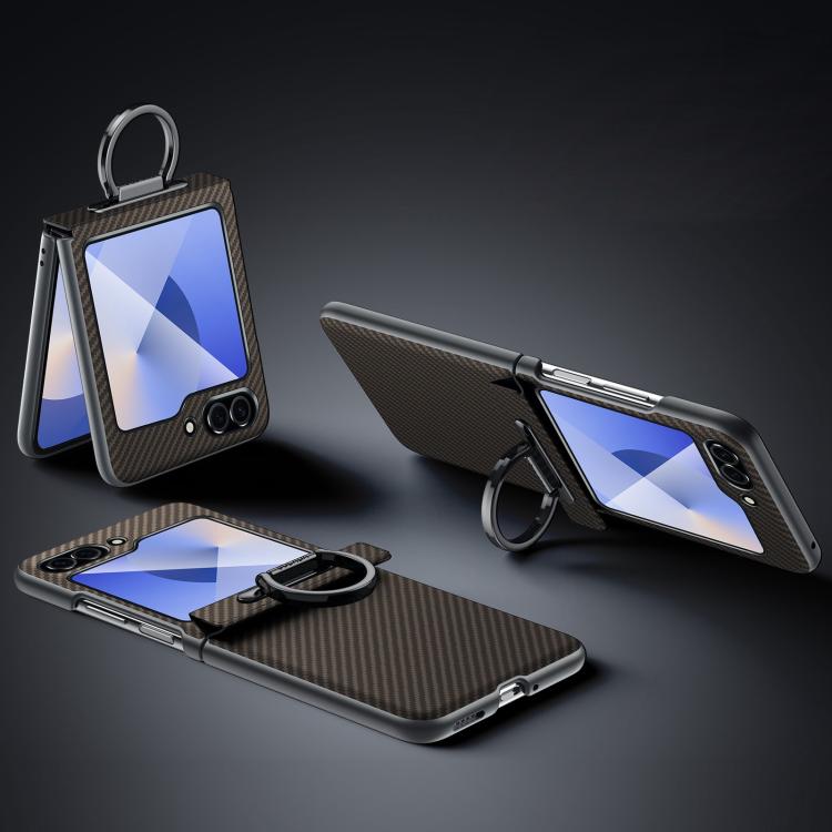 Funda SULADA 600D con textura de Kevlar para Samsung Galaxy Z Flip6, a prueba de golpes, de PC, con soporte para anillo (marrón)