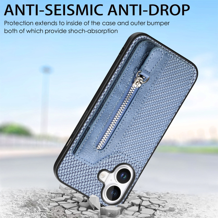 Funda Tipo Billetera con Cremallera y Tapa Horizontal Fibra de Carbono iPhone 16 (Azul)