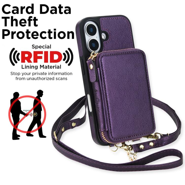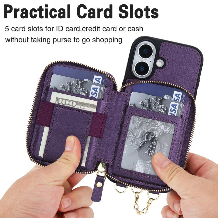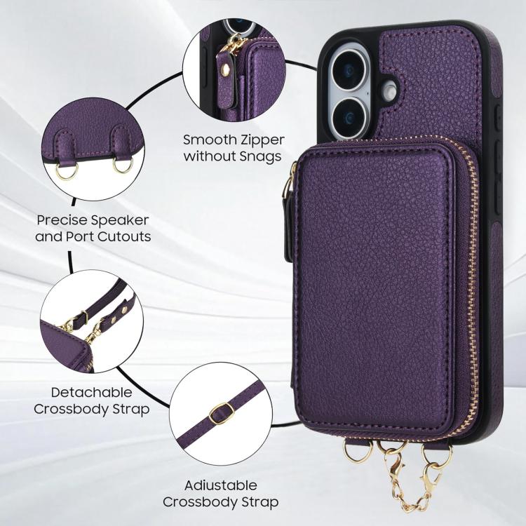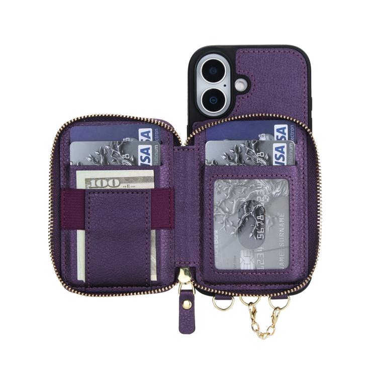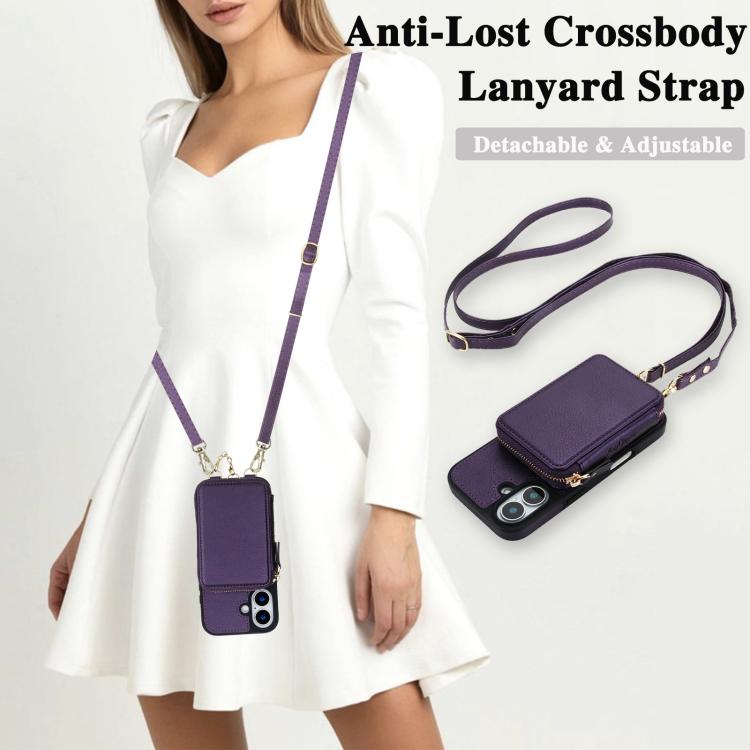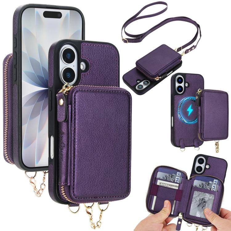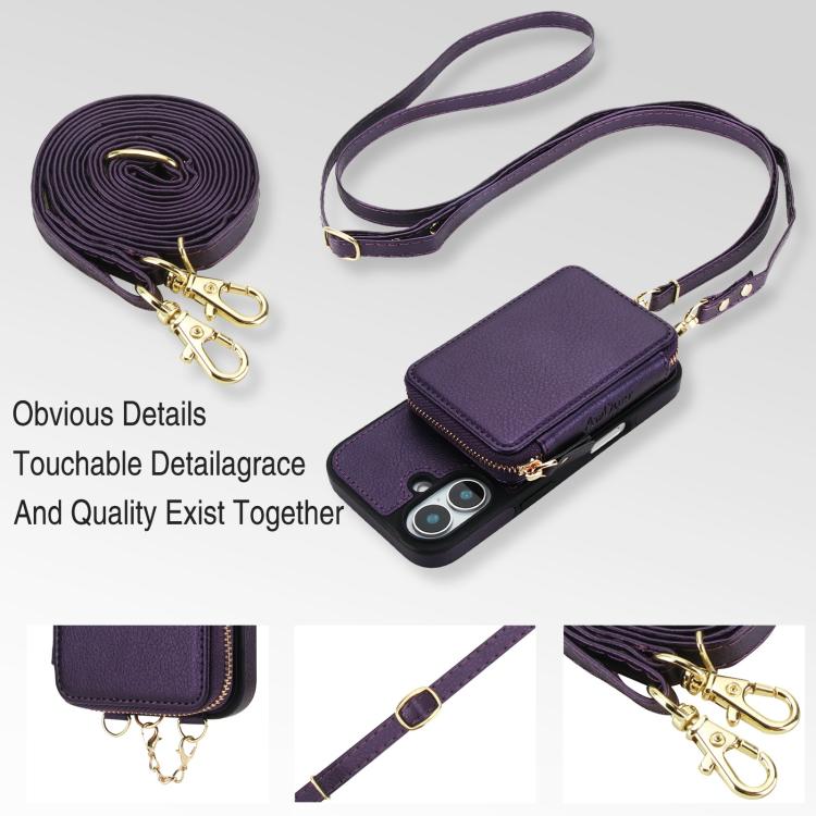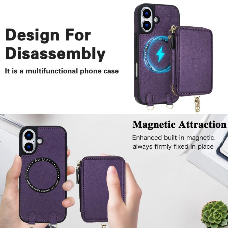 Funda tipo cartera bandolera con cremallera AwQuer 2 en 1 para iPhone 17, con parte trasera de cuero (morado oscuro).
