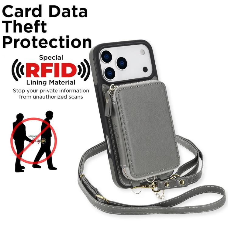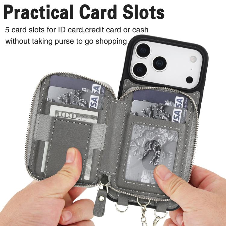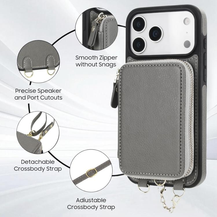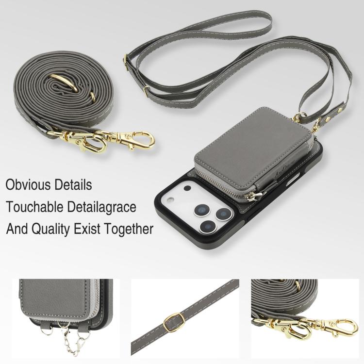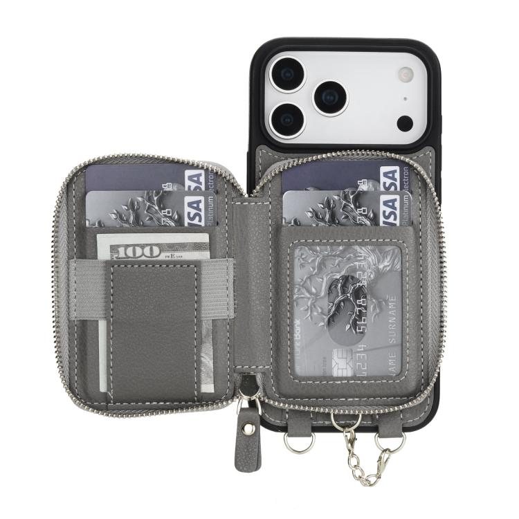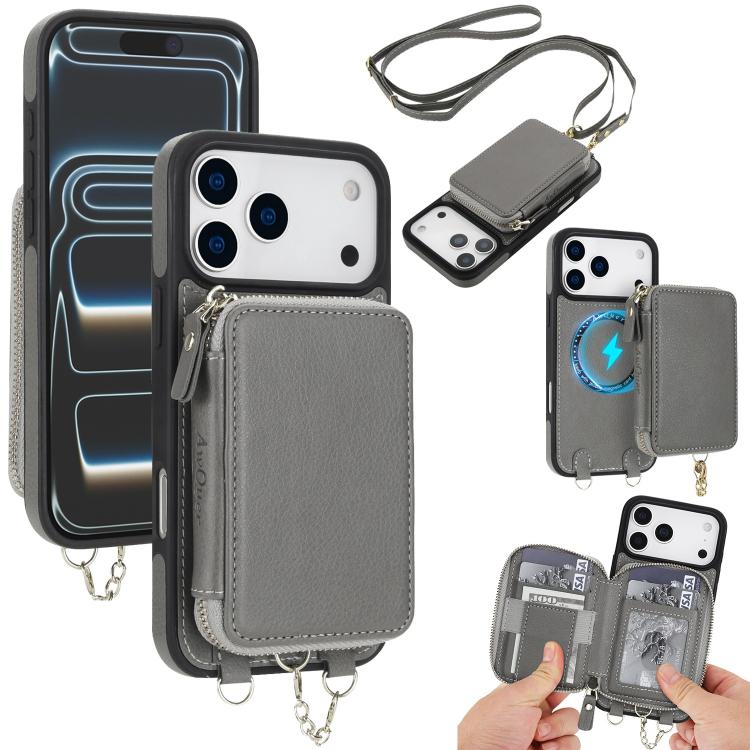 Funda tipo cartera bandolera con cremallera AwQuer 2 en 1 para iPhone 17 Pro con parte trasera de cuero (Gris)