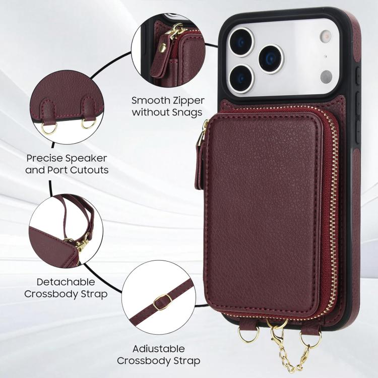 Funda tipo cartera bandolera con cremallera AwQuer 2 en 1 para iPhone 17 Pro Max, con parte trasera de cuero (rojo vino).