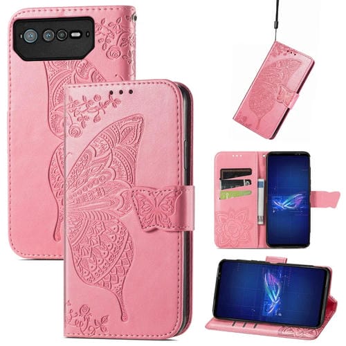 Funda de Cuero Asus Rog Phone 6 Butterfly Love Flower con Tapa en Relieve (Rosa)