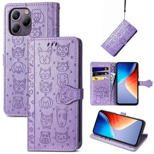 Funda de Cuero para BlackView A96 con Relieve Perros y Gatos (Púrpura)