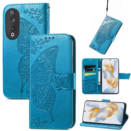 Funda para Teléfono Honor 90 Cuero con Relieve Flor de Amor y Mariposa (Azul)