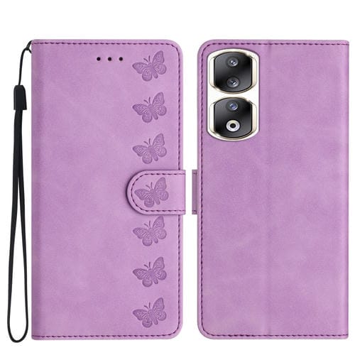 Funda de Cuero para Honor 90 Pro Seven Butterflies en Relieve (Púrpura)