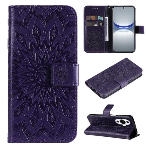 Funda de Cuero para Huawei Nova 12S con Tapa y Patrón de Girasol en Relieve (Púrpura)