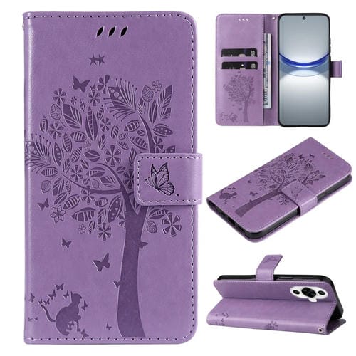 Funda para Huawei Nova 12S de Cuero con Tapa y Patrón en Relieve Árbol y Gato (Púrpura Claro)