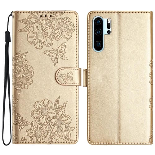 Funda para Huawei P30 Pro Cherry Blossom Butterfly Skin Feel de PU en Relieve (Oro)