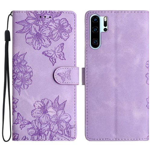 - 1x Funda para Huawei P30 Pro Cherry Blossom Butterfly Skin Feel de PU en Relieve (Púrpura)