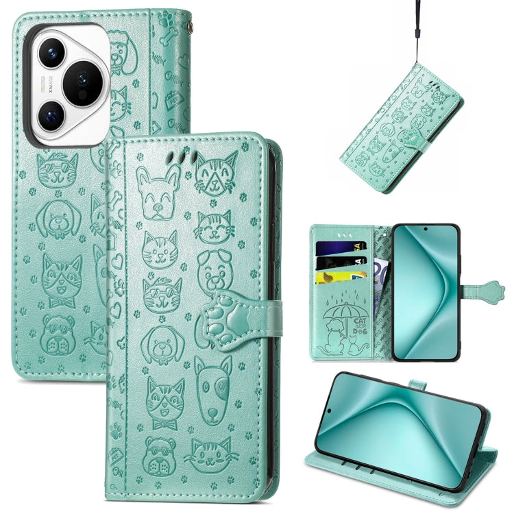 Funda de Cuero para Huawei Pura 70 con Relieve Perros y Gatos (Verde)