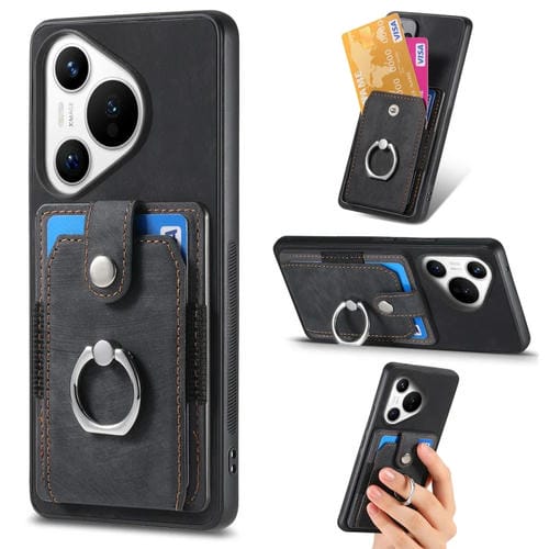 Funda para Huawei Pura 70 Pro con Billetera, Tarjeta y Anillo, Sensación de Piel Retro (Negro)