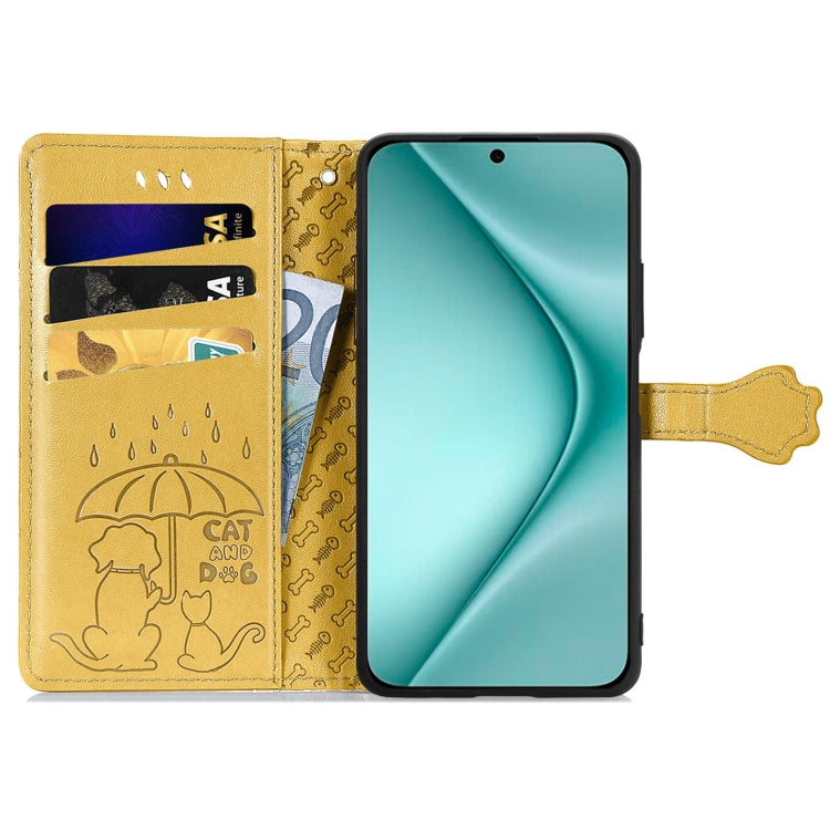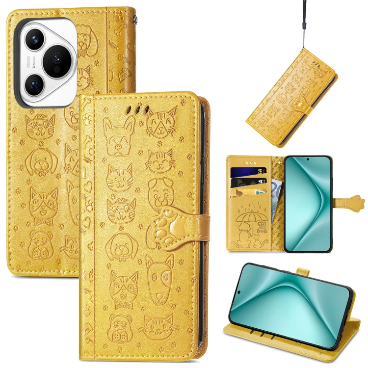 Funda para Huawei Pura 70 Pro de Cuero con Relieve de Perro y Gato (Amarillo)
