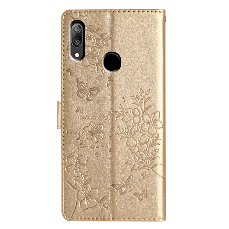 - 1x Funda para Huawei Y7 2019 de Cuero con Relieve Flor de Amor y Mariposa (Dorado)