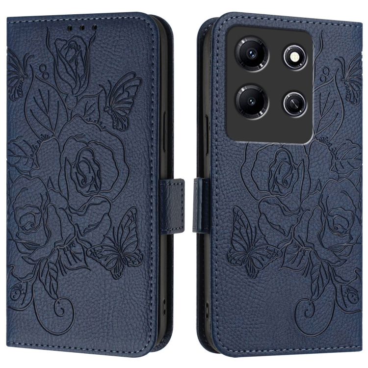 Funda de Cuero Antirrobo RFID para Infinix Note 30I con Rosa en Relieve (Azul Oscuro)