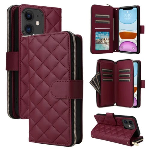 Funda para Teléfono iPhone 11 Cuero con Hebilla de Torre y Cremallera Rombal Cruzada con Cordón (Rojo Vino)