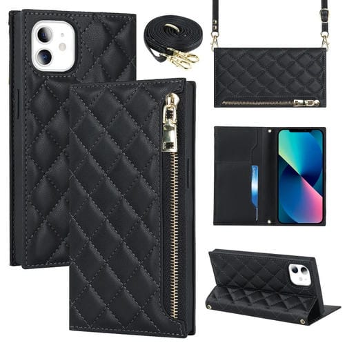 Funda de Cuero para iPhone 11 Grid Texture con Lanyard y Cremallera (Negro)