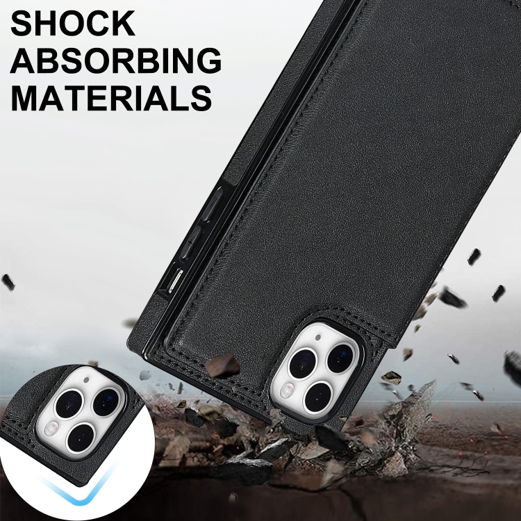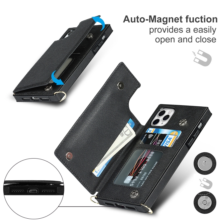 Funda para iPhone 11 Pro Max Cross-Body Square Doble Hebilla Flip Card Bag TPU + PU con Ranuras para Tarjetas y Billetera y Correa (Negro)