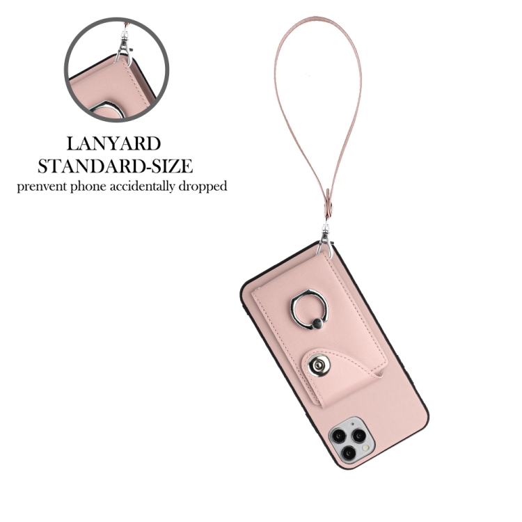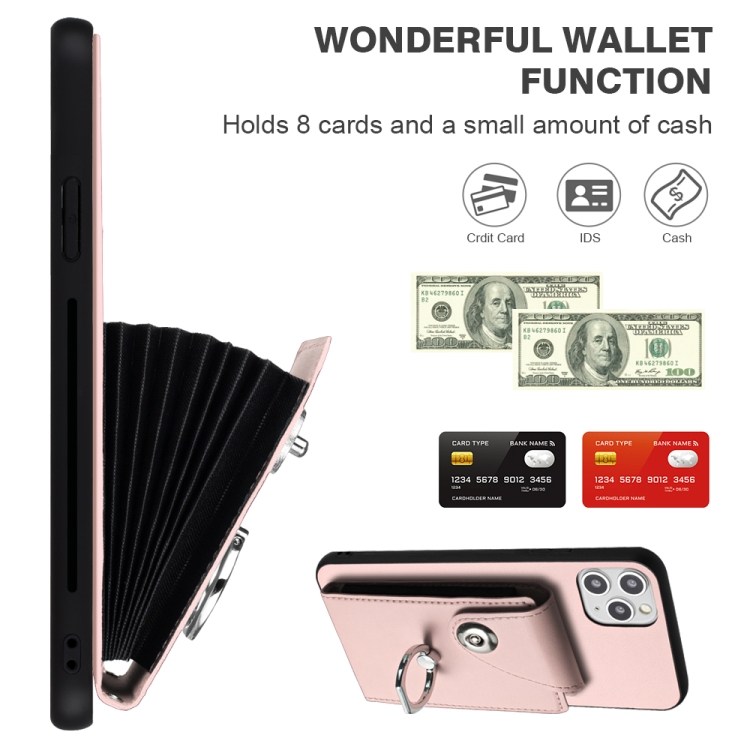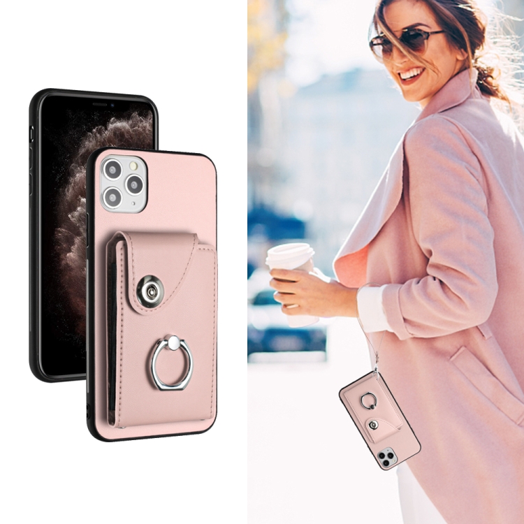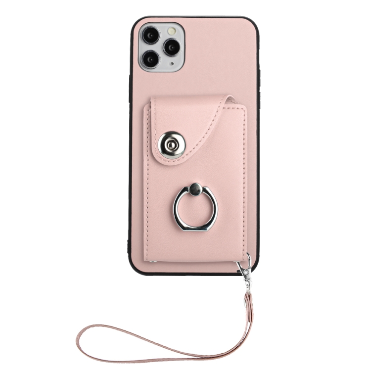 Funda para Teléfono iPhone 11 Pro Max de PU con Soporte para Anillo y Bolsa para Tarjeta de Órgano con Cordón (Rosa)
