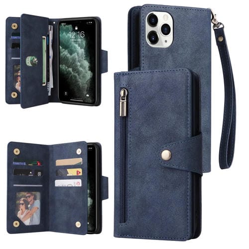 Funda de Cuero para iPhone 11 Pro Max Rivet Buckle Tres Pliegues 9 Cards (Azul)