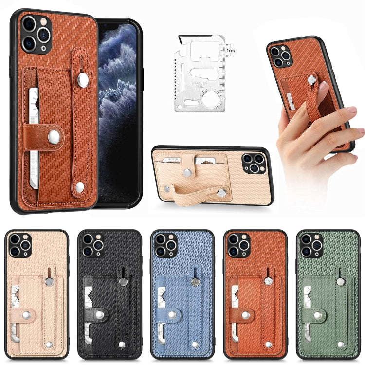 Funda para iPhone 11 Pro Max Wristband Kickstand Card Wallet Back Cover con Tool Knife (Marrón)