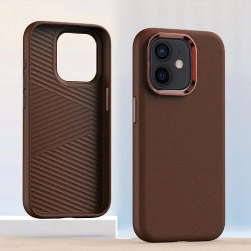 Estuche para Teléfono iPhone 12 Cobertura Total Cuero Marco de Lente Metal (Marrón)