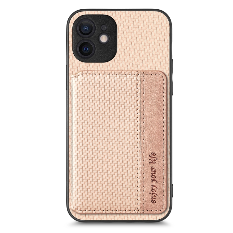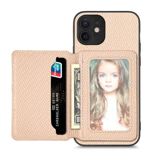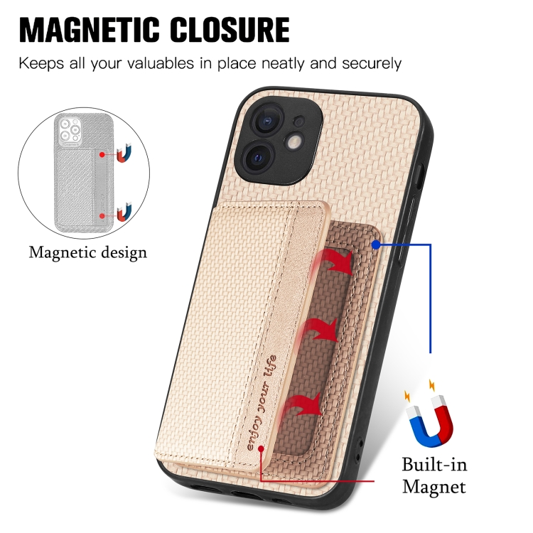 Caja de teléfono para iPhone 12 Mini con bolsa de tarjeta magnética de fibra de carbono (Caqui)