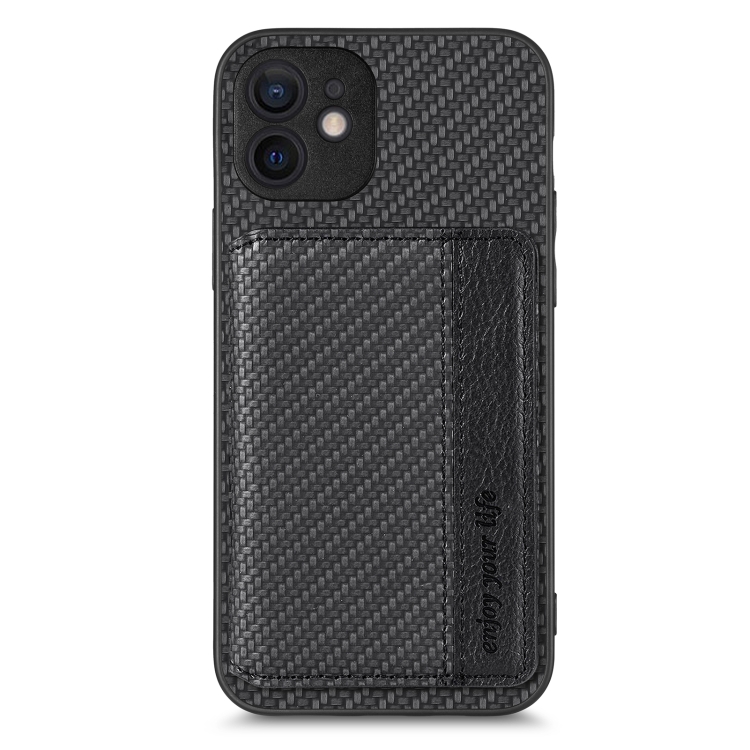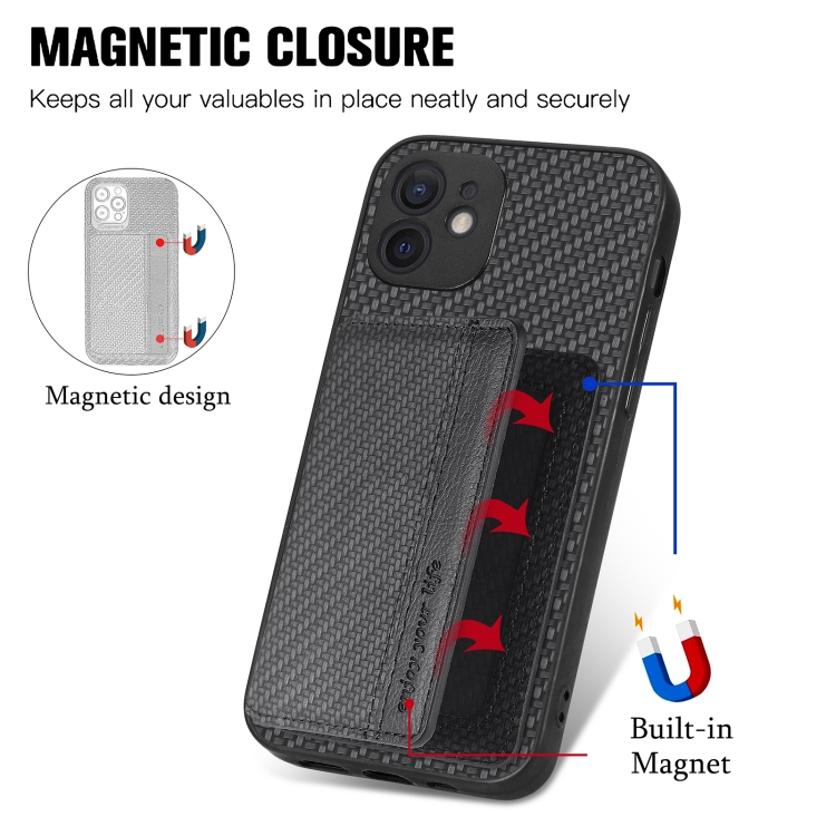 Caja de teléfono para iPhone 12 Mini con bolsa de tarjeta magnética de fibra de carbono (Negro)