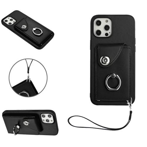 Funda para Teléfono iPhone 12 Mini PU con Soporte para Anillo y Bolsa para Tarjeta con Cordón (Negro)