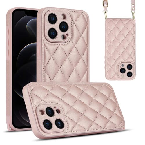 Estuche para Teléfono iPhone 12 Pro Textura Rómbica Cordón Doble (Oro Rosa)