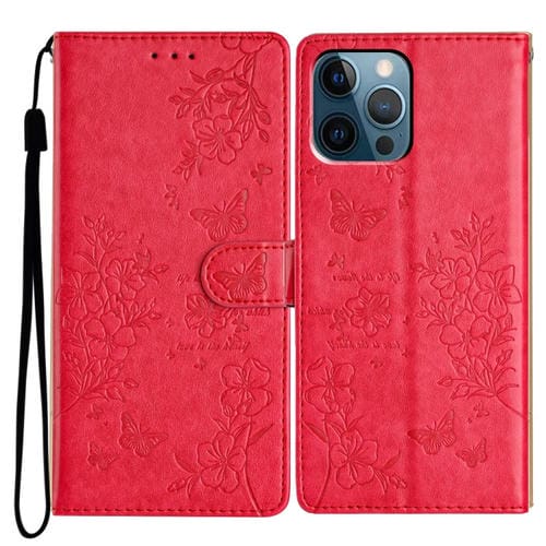 Funda para iPhone 12 Pro Max Butterfly Love Flower de Cuero En Relieve (Rojo)