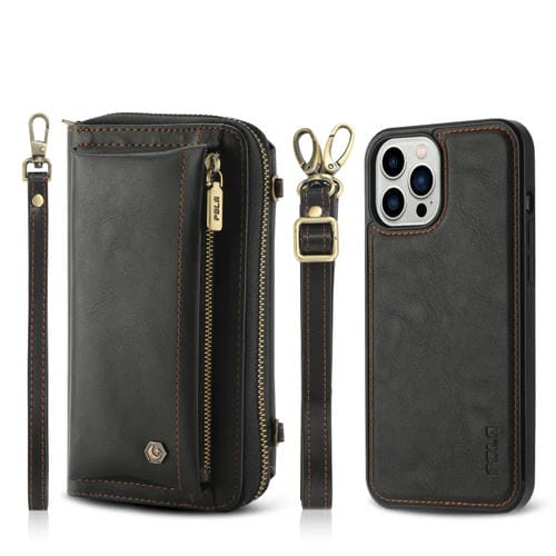 Funda para iPhone 12 Pro Max Crossbody de Cuero con Billetera y Cremallera Multifuncional (Negro)