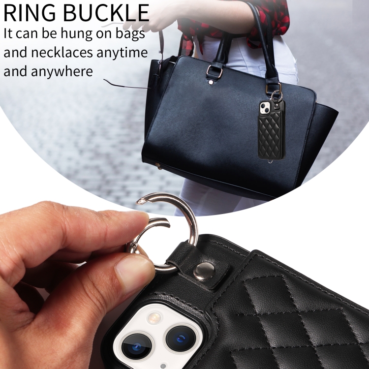 Funda para teléfono iPhone 13 con bolsa para tarjetas textura rómbica y cordón corto (Negro)
