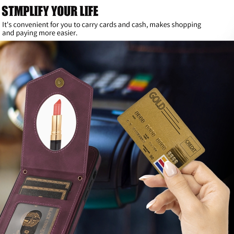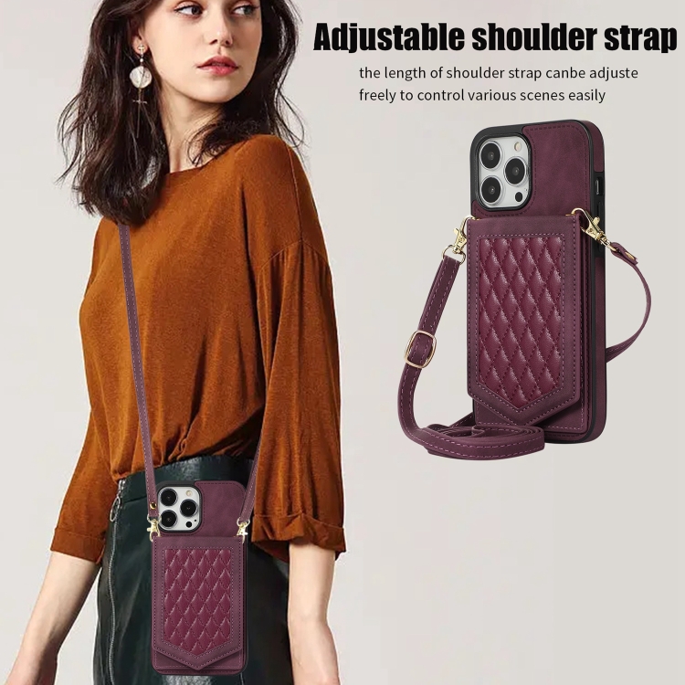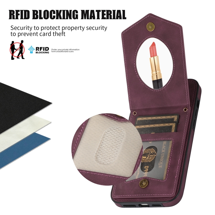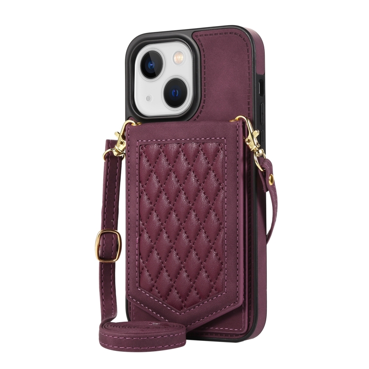 Funda para iPhone 13 Mini Rhombic Texture Rfid con Cordón y Espejo (Rojo Vino)