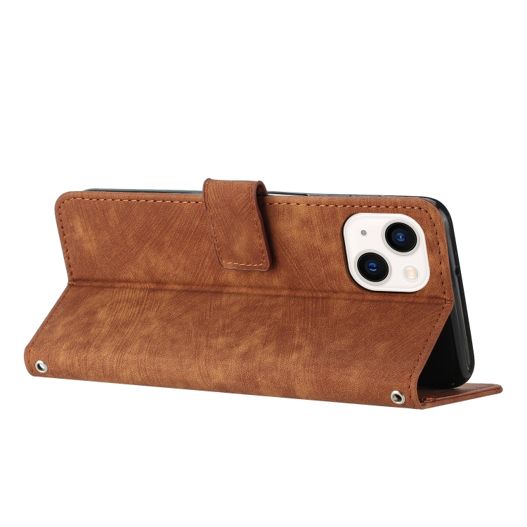 Funda para teléfono iPhone 13 Mini Skin Feel Stripe Pattern cuero con cordón (Marrón)