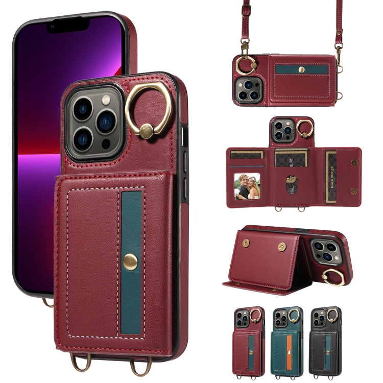 Funda de Cuero para Teléfono iPhone 13 Pro con Soporte para Anillo y Bolso Cruzado para Tarjeta (Rojo)