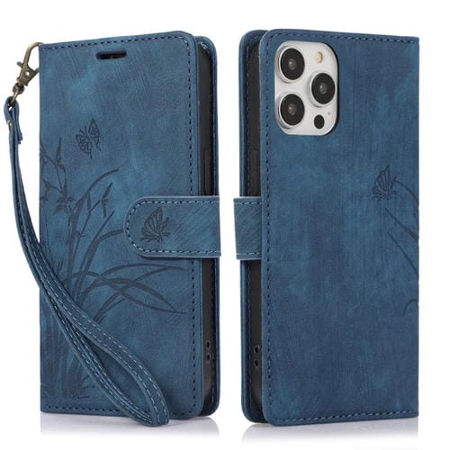 Funda para Teléfono iPhone 13 Pro Cuero con Relieve Mariposa Orquídea (Azul)