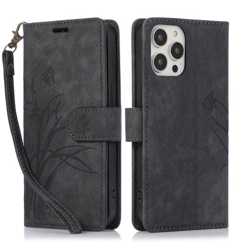 Funda para Teléfono iPhone 13 Pro Cuero con Relieve de Mariposa Orquídea (Negro)