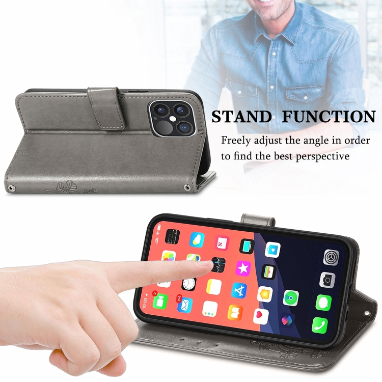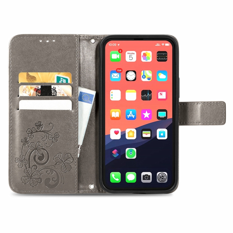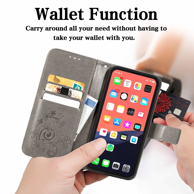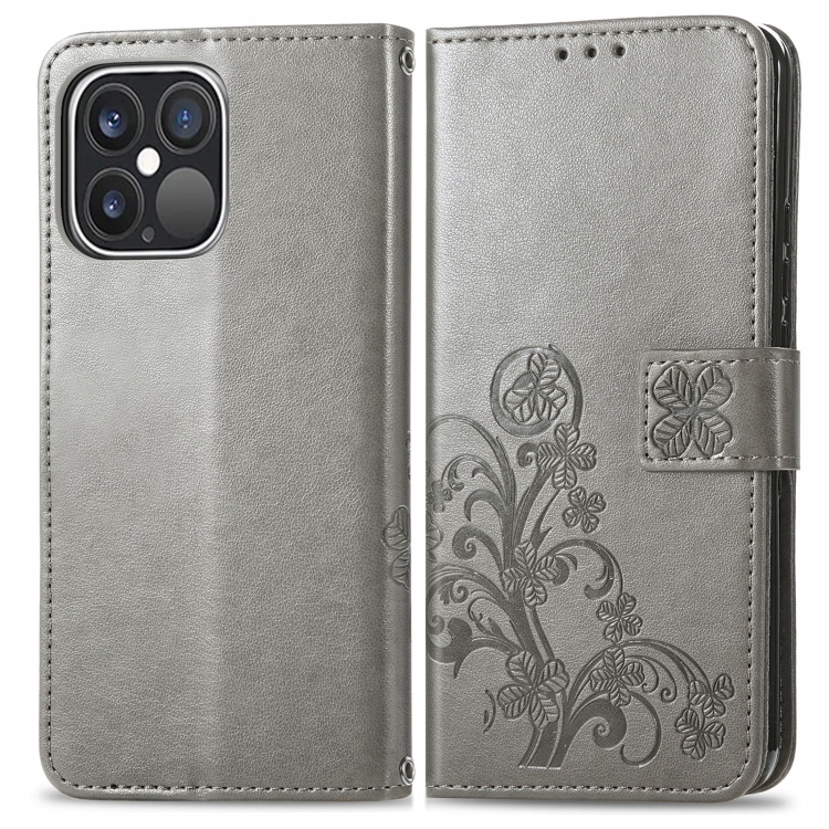 Funda de Cuero para iPhone 13 Pro Max Cierre de Trébol Hebilla En Relieve Protección con Cordón Ranura para Tarjeta Monedero Soporte (Gris)