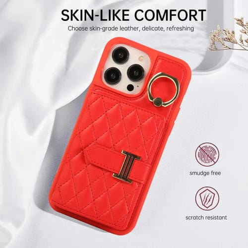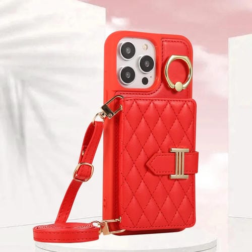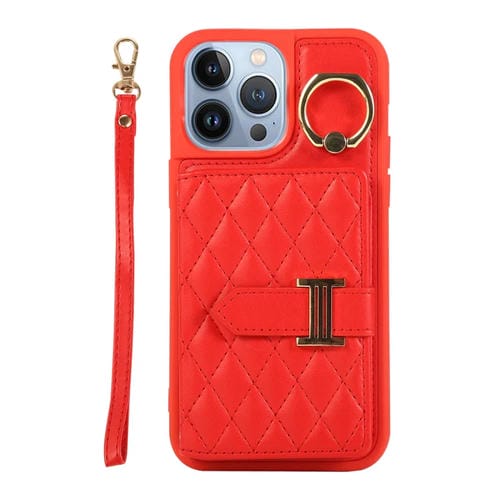 Funda para teléfono iPhone 13 Pro Max Horizontal Card Bag Ring Holder con doble cordón (Rojo)
