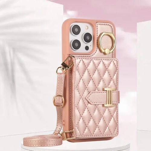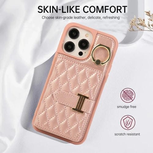 Funda para iPhone 13 Pro Max Horizontal Card Bag Ring Holder con Doble Cordón (Oro Rosa)