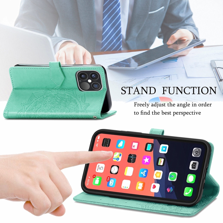Estuche para iPhone 13 Pro Max Mandala Flower Cuero Tapa Horizontal En Relieve Soporte Ranuras Billetera Cordón (Verde)