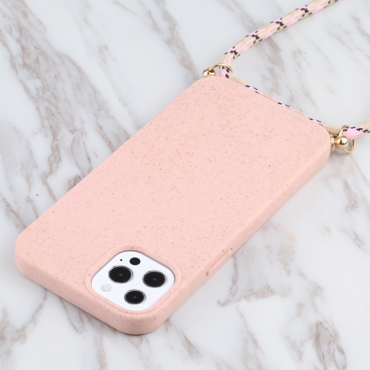 Funda para iPhone 13 Pro Max Material de Paja de Trigo Estuche TPU a Prueba de Golpes con Cordón para el Cuello (Rosa)