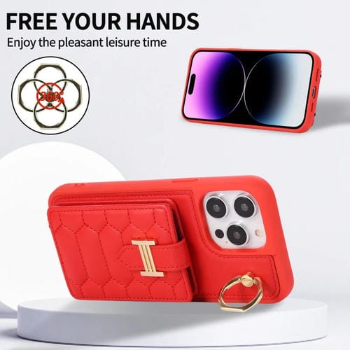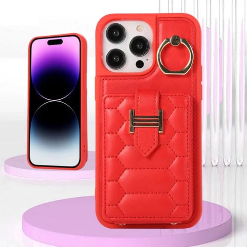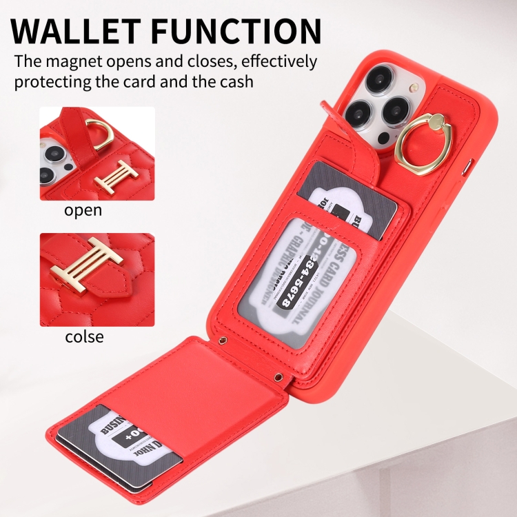 Funda para teléfono iPhone 13 Pro Max Vertical Card Bag Ring Holder con doble cordón (Rojo)