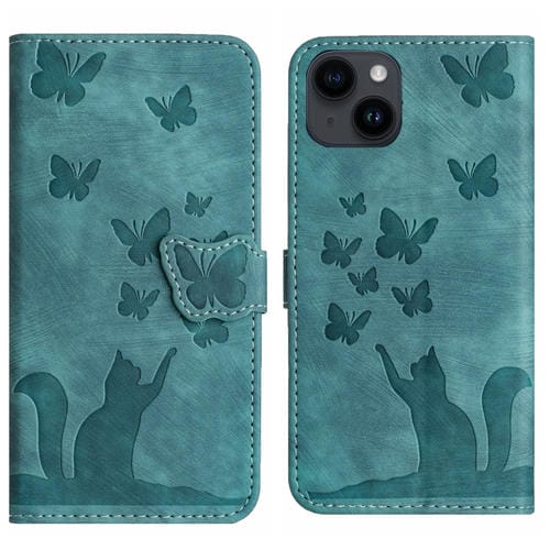 Funda de Cuero para iPhone 14 con Tapa y Estampado de Gato Mariposa (Wathet)