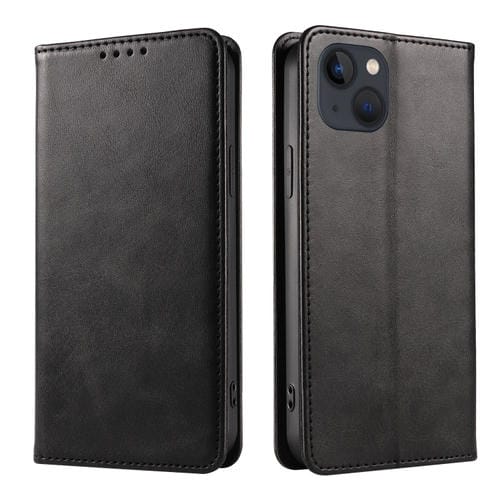 Funda de Teléfono iPhone 14 Cuero Tapa Magnética Textura de Becerro (Negro)