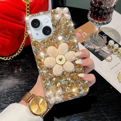Funda para Teléfono iPhone 14 Soporte Girasol PC Diamantes Colocados a Mano (Dorado)
