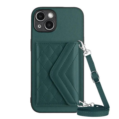Funda para Teléfono iPhone 14 Rfid con Bolsa para Tarjetas Textura Rómbica Cordón Largo (Verde)