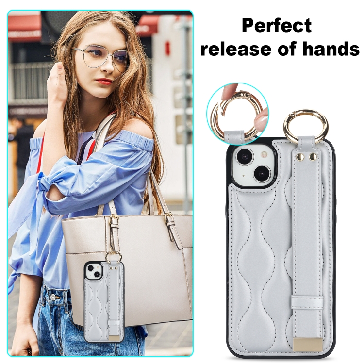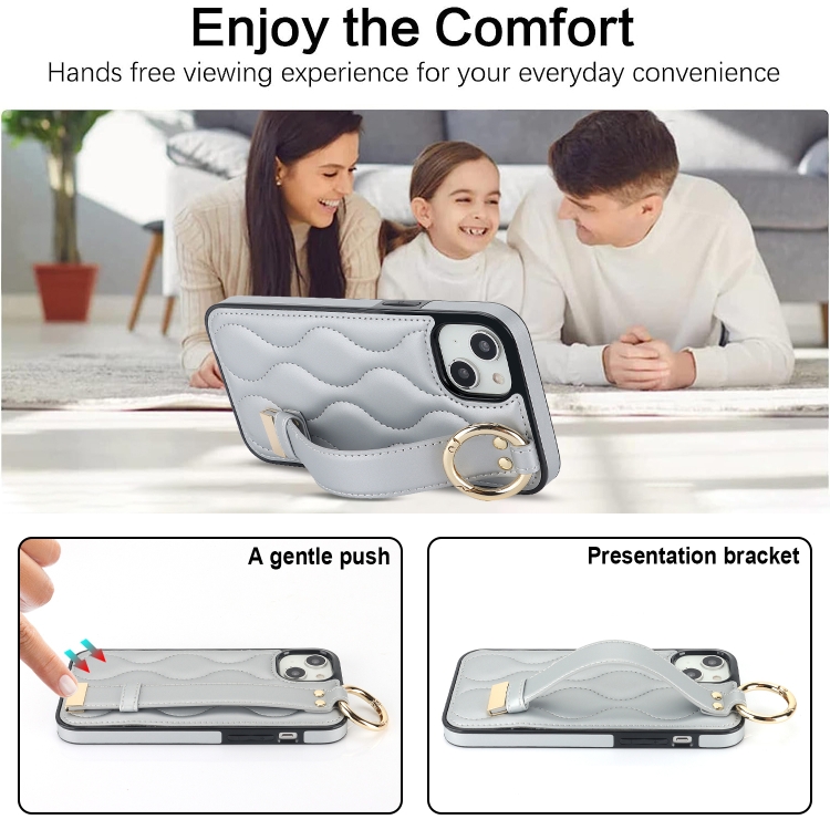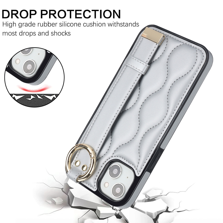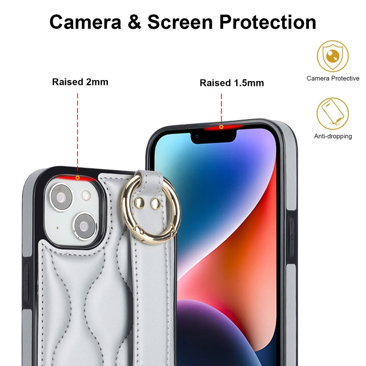 Funda para Teléfono iPhone 14 Plus Cobertura Completa Anillo PU con Muñequera (Plata)