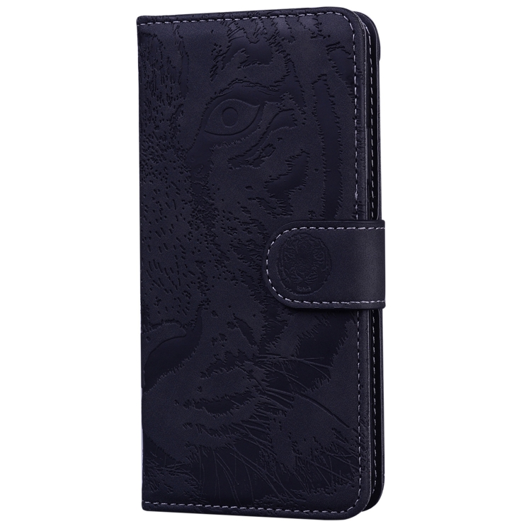 Funda de teléfono iPhone 14 Plus cuero estampado tigre en relieve (Negro)