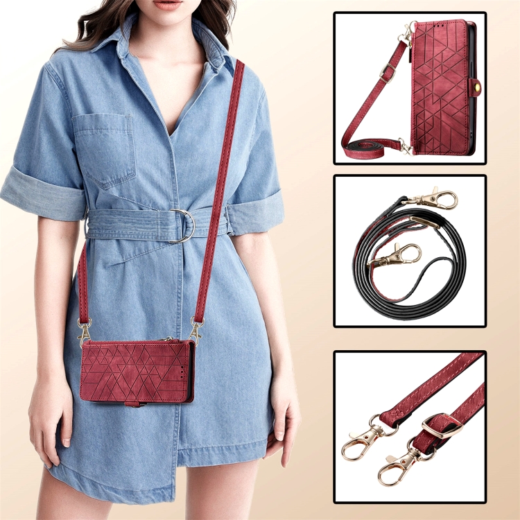 Funda para teléfono iPhone 14 Plus cuero con hebilla lateral y billetera con cremallera geométrica y cordón cruzado (Rojo)